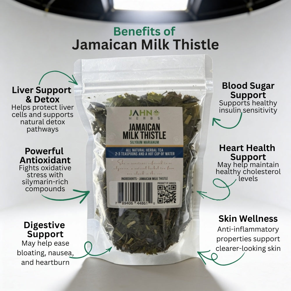 Jamaican Milk Thistle Tea supports liver health and detoxification. This caffeine-free herbal tea may help with digestive comfort, blood sugar balance, heart health, and skin wellness. Packed with antioxidants to combat oxidative stress, it's an ideal addition to your daily wellness routine.